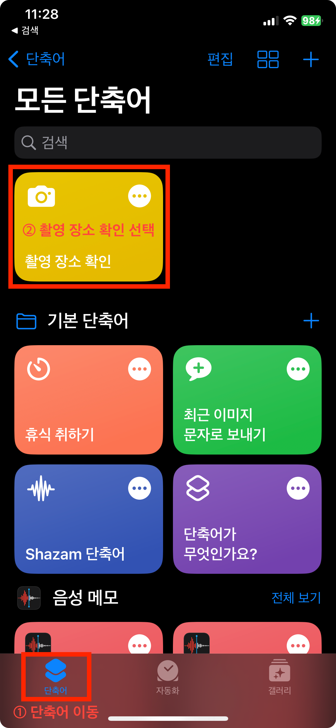 '단축어' 탭으로 이동한 후 '촬영 장소 확인' 단축어 실행 순서를 확인하거나 실행할 수 있다.