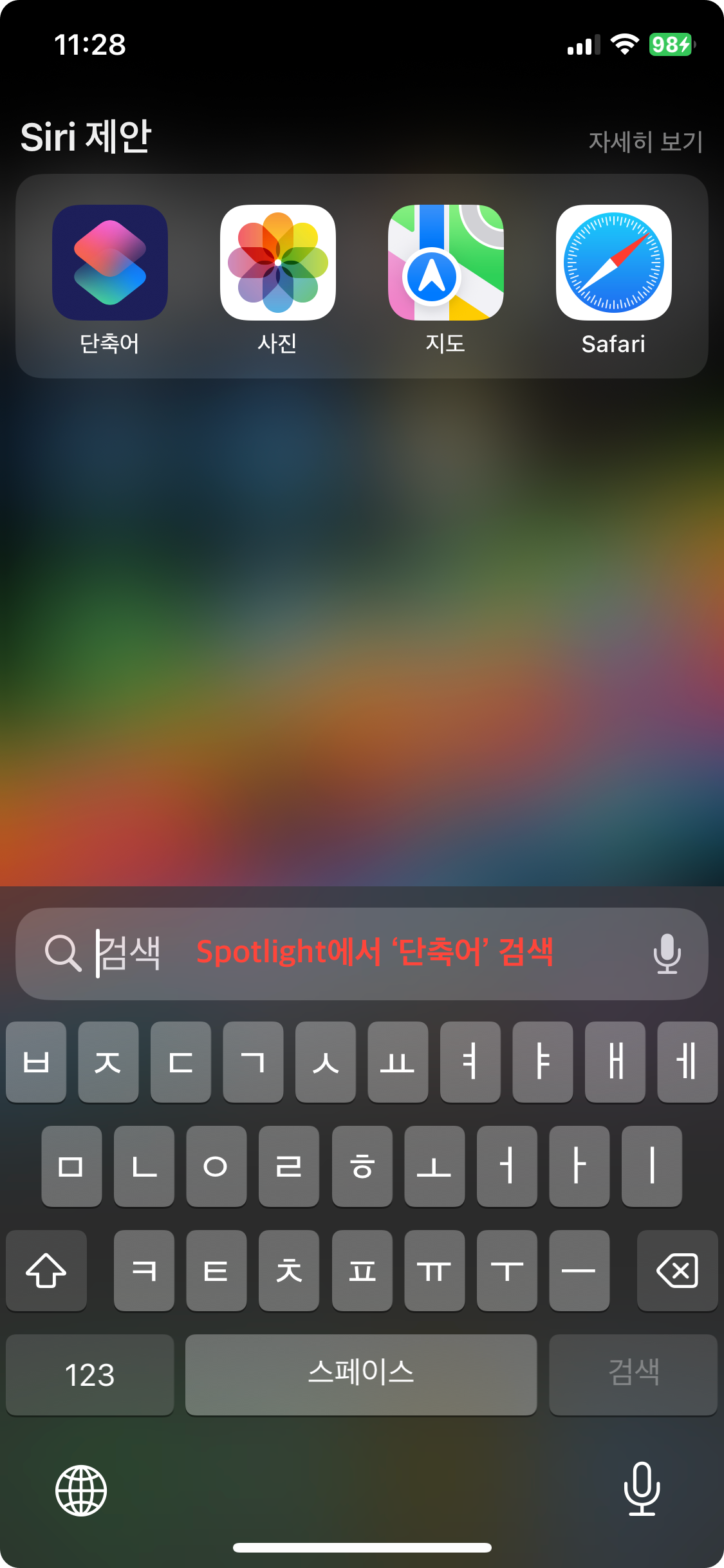 대기화면에서 Spotlight에서 '단축어' 검색해서 단축어 앱을 실행한다.